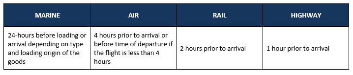 Canada Border Services Agency (CBSA) requires Advance Commercial Information prior to entry into Canada. This is similar to the U.S. CBP’s Automated Manifest System (AMS) requirements. The data is received and validated by the CBSA prior to arrival within prescribed, mode-specific time frames: