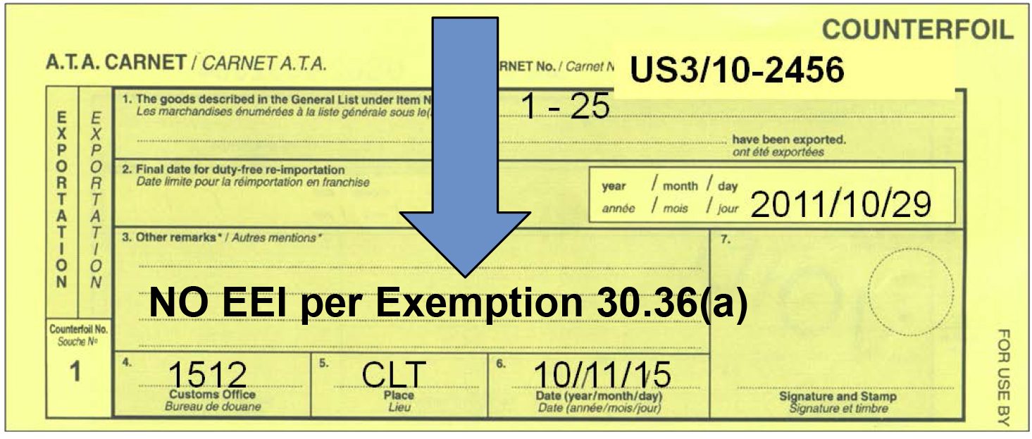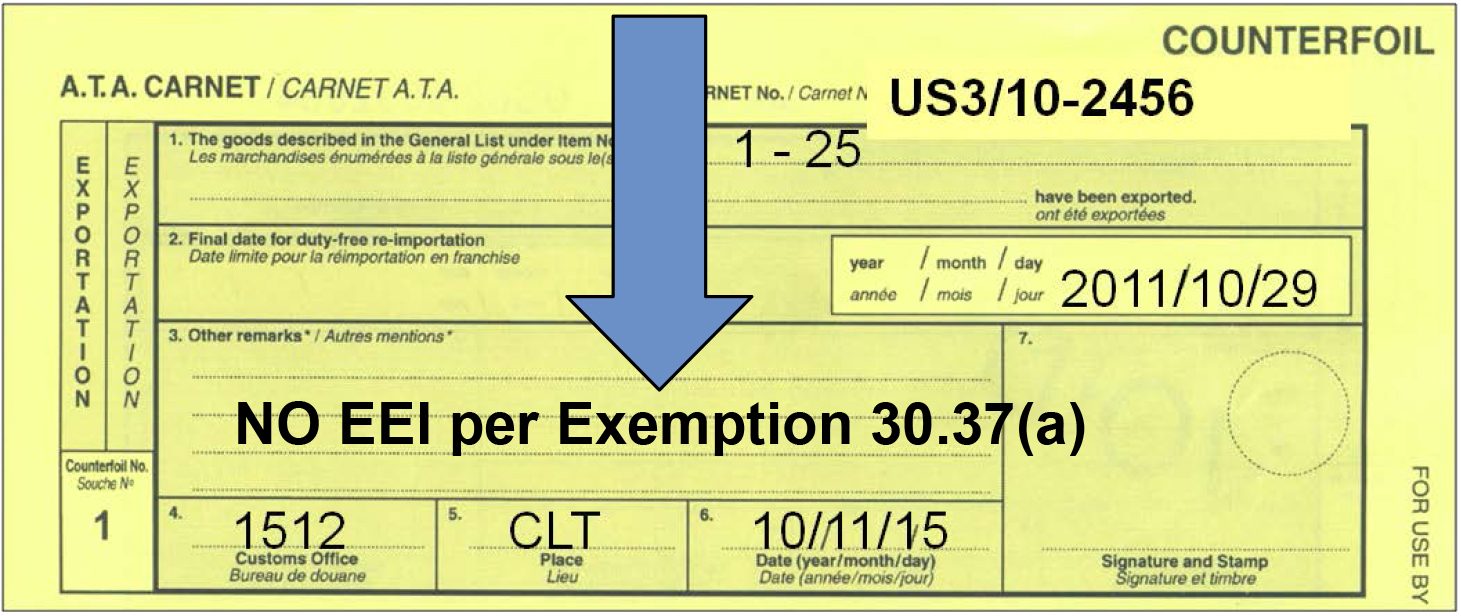 This exemption needs to be recorded on the yellow exportation counterfoil in box 3 for “Other remarks” as: NO EEI per Exemption 30.37(a) |