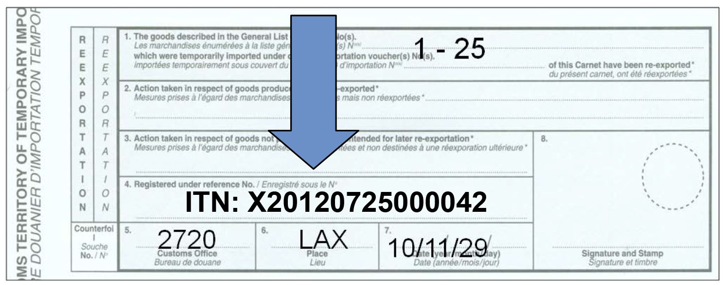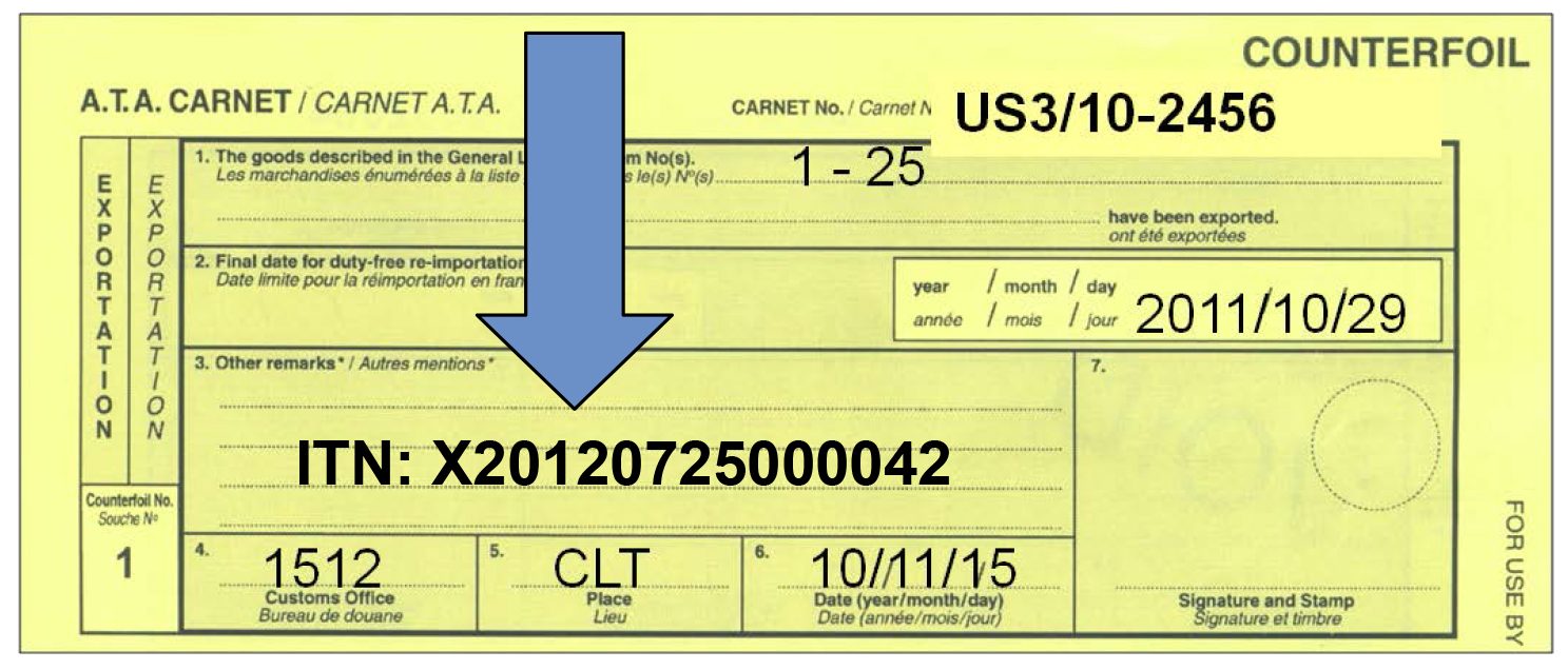Once the EEI filing is submitted, you will receive an email confirmation containing your unique Internal Transaction Number (ITN). This must be recorded on the exportation counterfoil in the box 3 for “Other remarks” (U.S. ATA Carnet) or box 4 “Registered under reference No.” (foreign ATA Carnet). |